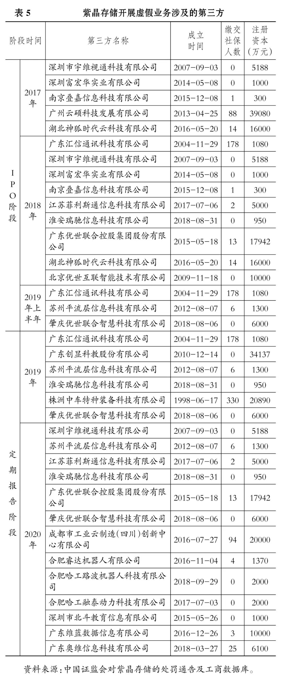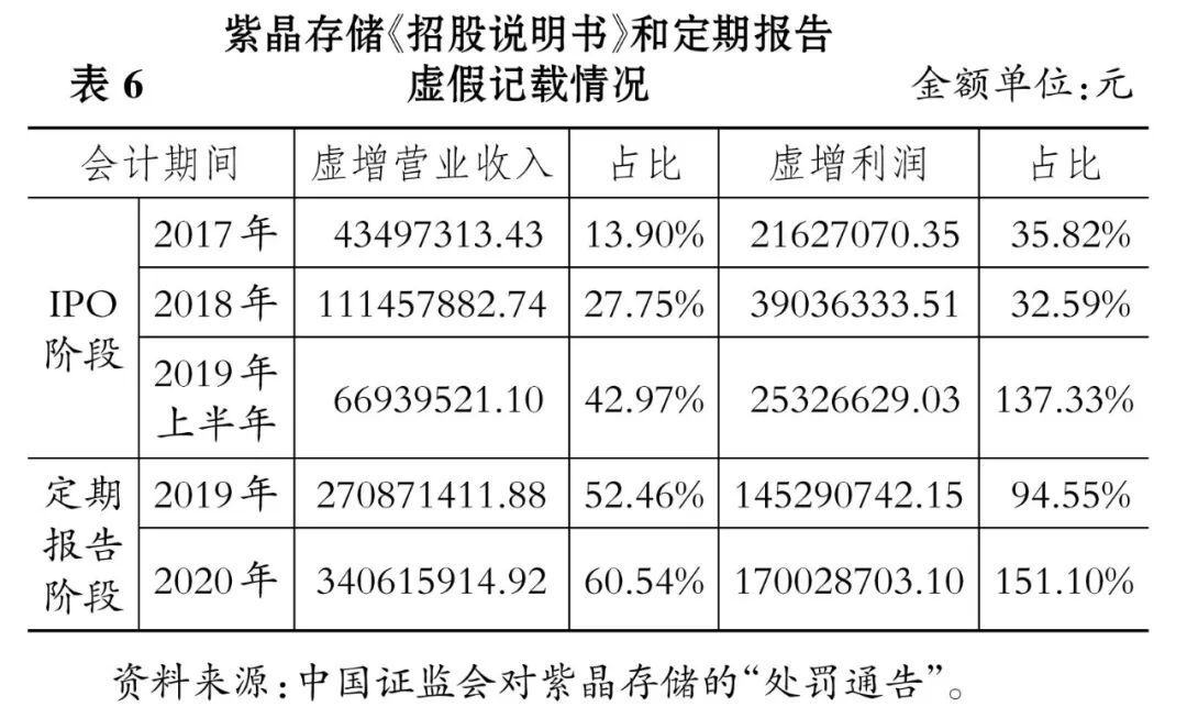 处罚通告显示,紫晶存储在上市前和上市后均存在严重的财务造假。其披露的《招股说明书》(2017年、2018年和2019年上半年)和定期报告(2019年和2020年)显示,通过与第三方(见表5)开展虚假业务,采用虚构销售合同、伪造物流单据和验收单据入账、安排资金回款、提前确认收入等方式虚增营业收入和利润,具体情况如表6所示。