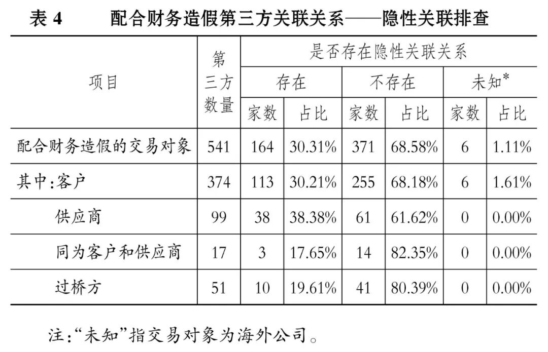 3. 配合财务造假第三方的关联关系。已有研究表明,在准则规定的关联方关系与关联交易范围之外,不少上市公司与客户和供应商存在“隐性关联关系”,并借此隐藏关联交易以规避信息披露义务,进而以更加“隐蔽”的方式实施盈余管理乃至财务造假。因此,有必要基于年报数据与供应链工商数据的“共同人物关系”与“共同联系关系”度量并识别隐性关联关系(黄世忠等,2024)。本文利用天健财判及工商数据库,对53家存在配合财务造假的上市公司及其对应的541家第三方进行隐性关联关系穿透排查,结果如表4所示。