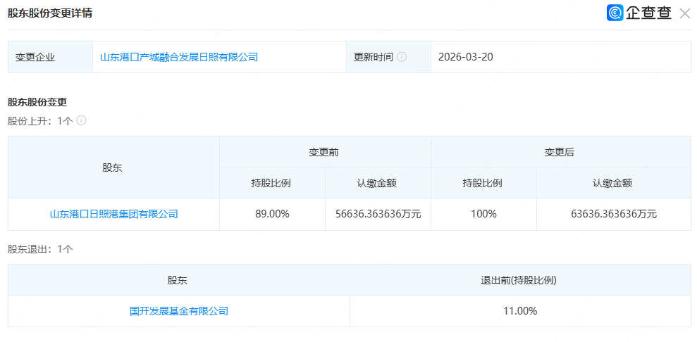 经济导报记者 王伟3月20日,企查查信息显示,山东港口日照港集团有限公司(下称“山东港口日照港”)对山东港口产城融合发展日照有限公司(下称“产城融合发展日照公司”)的持股比例由89%上升至100%。变更前,山东港口日照港认缴金额为5.66亿元;变更后,认缴金额升至6.36亿元,增资7000万元。
