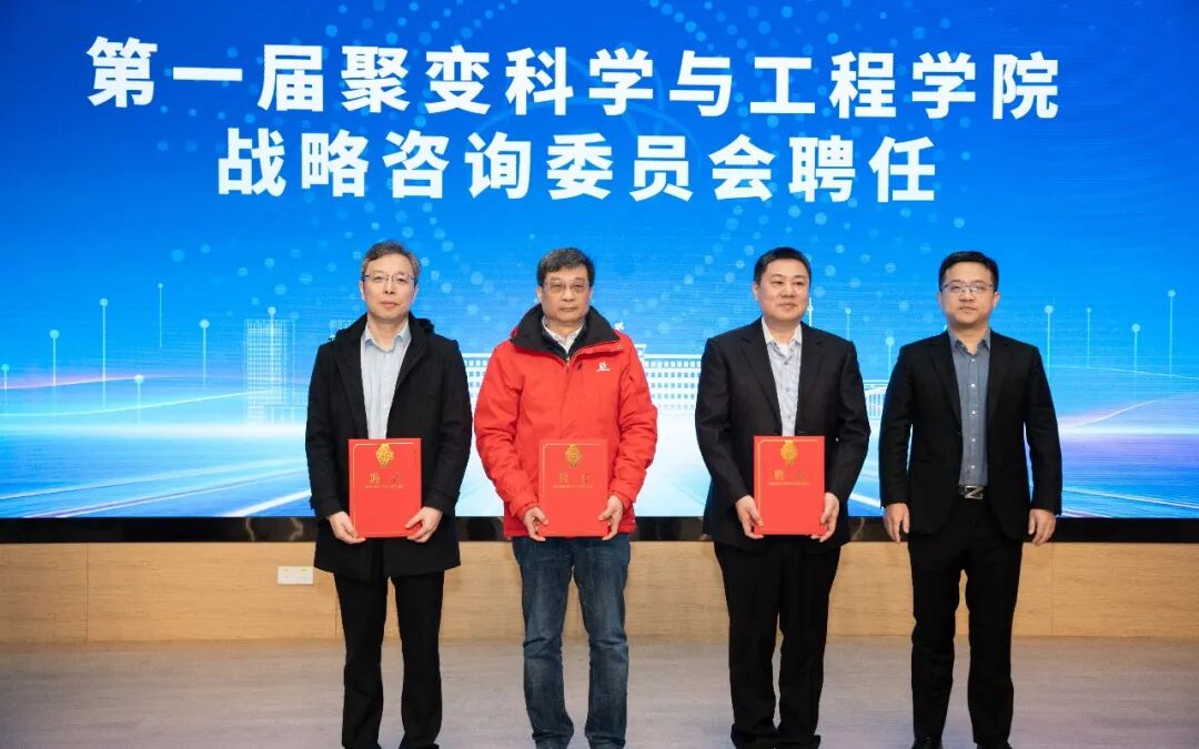 大会同期举行聚变科学与工程学院第一届战略咨询委员会聘任仪式,中国工程院李建刚院士等二十余位聚变领域顶尖专家学者受聘为首批委员,聚变新能(安徽)有限公司董事长严建文教授(右二)受聘战略咨询委员会副主任。