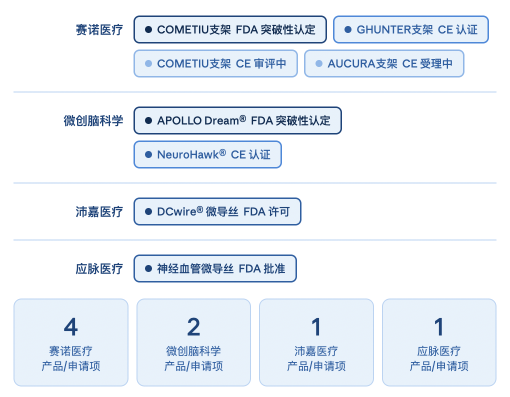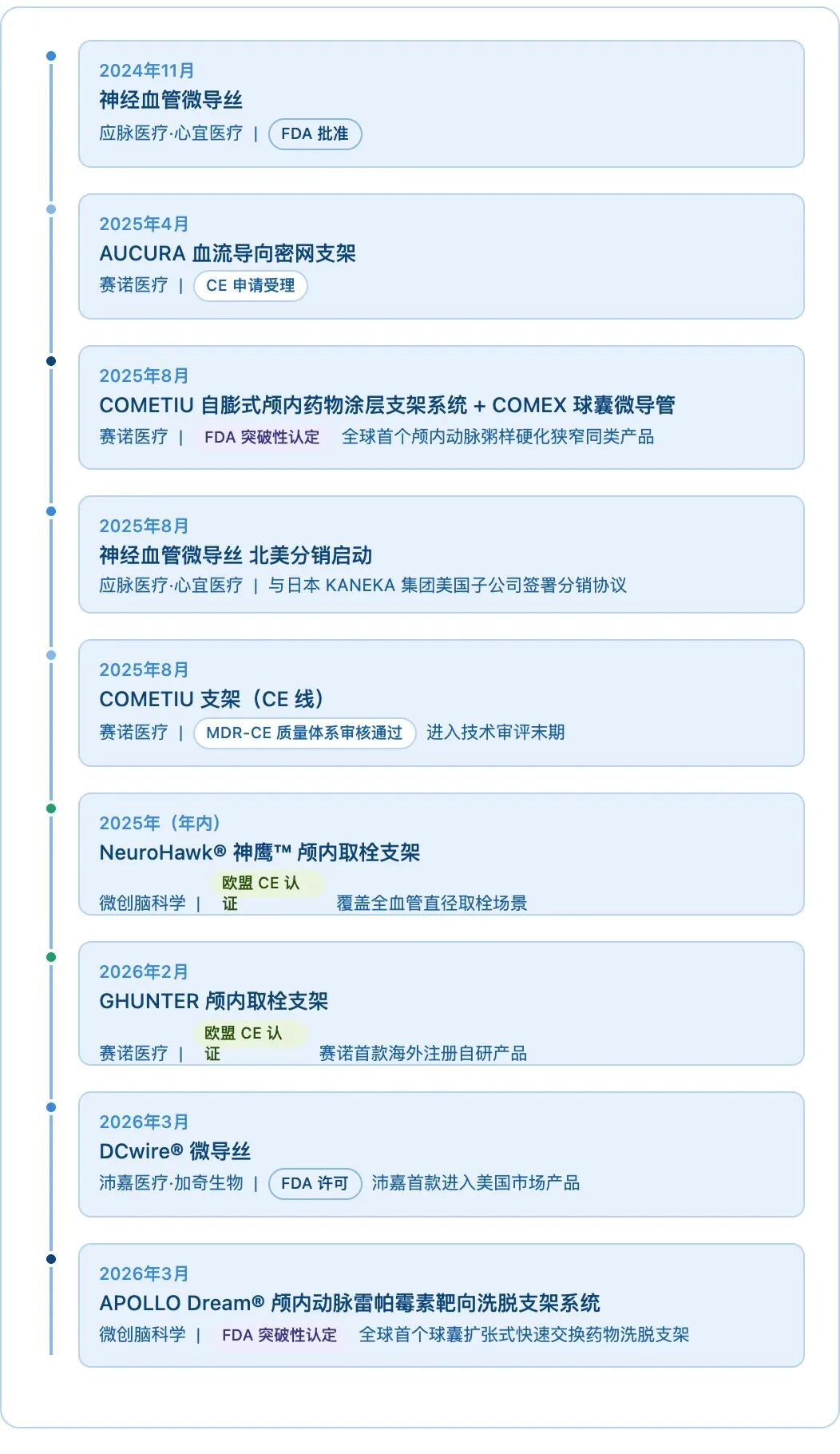 赛诺医疗布局最广,同时推进FDA BDD认定(COMETIU)、欧盟CE认证(GHUNTER)以及CE审评进行中的两条线(COMETIU、AUCURA),在产品类型上横跨颅内狭窄支架、取栓支架、血流导向支架和球囊微导管,形成了梯次化的商业化节奏。