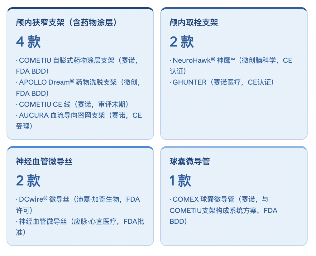 观察本轮神经介入器械出海的产品矩阵可以发现,国内企业的国际化策略正在从早期的"单一产品试水"演进为"多品类、多认证渠道、多市场"的协同推进模式。