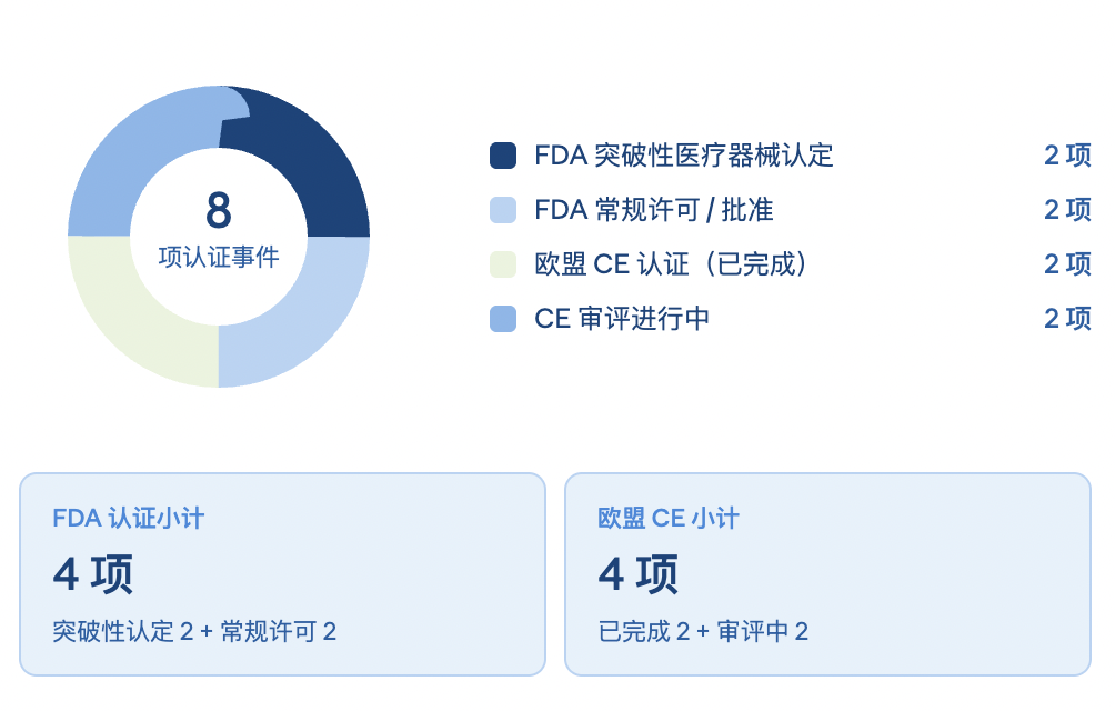 从此间获证产品的全貌来看,8项认证事件横跨四类器械,FDA与CE各占一半,且已有2项FDA突破性认定落地——这是此前中国神经介入器械从未触及的高度;FDA常规许可2项、欧盟CE完成认证2项、CE审评进行中2项,四类并举,覆盖从最高含金量认定到市场落地的完整认证链条。