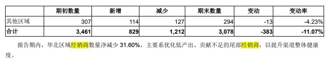 这并非个别区域现象,去年新乳业仅西南地区的经销商增多,其余均在收缩,公司经销商总数从3461家减少至3078家,缩水11%。而新乳业仅在财报中解释,华北地区经销商同比减少31.6%,是优化部分低产出、贡献不足的经销商所致,未对其他地区的收缩作说明。