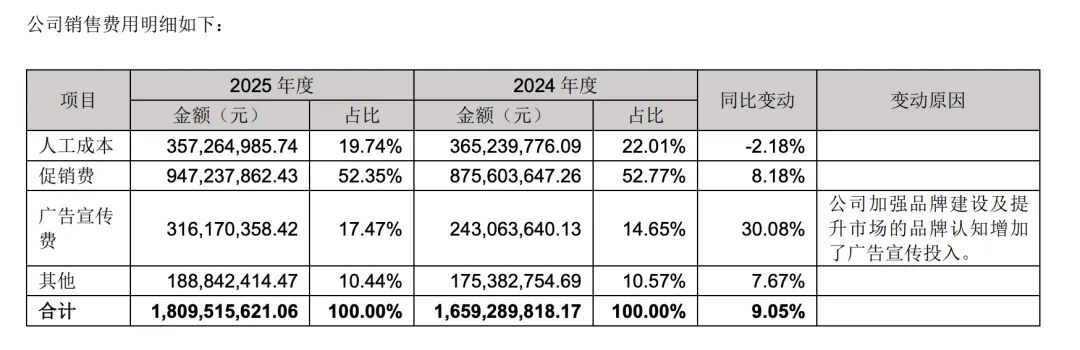 财报显示,公司去年销售费用同比增长9.05%至18.1亿元,增速高于营收增速。其中,广告宣传费达3.16亿元,增速超30%,占销售费用的比例提升至17.47%。
