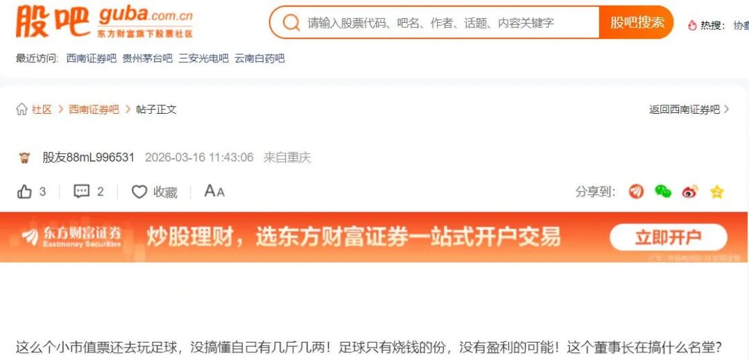 各个论坛里充斥着中小股东的质疑声,诸如,小市值券商盲目烧钱搞足球,不务正业。股价跌跌不休,不做强主业,反而去搞面子工程。