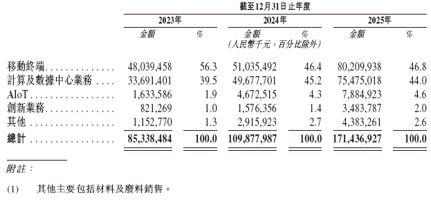 华勤技术的收入来自:(i)移动终端,主要包括智能手机、平板计算机及智能穿戴产品;(ii)计算及数据中心业务,主要包括个人计算机及数据基础设施产品;(iii) AIoT产品,如智能家居设备、XR产品及游戏硬件;(iv)创新业务,主要包括汽车电子及工业产品、机器人产品以及软件;(v)其他,主要包括材料和废料销售。