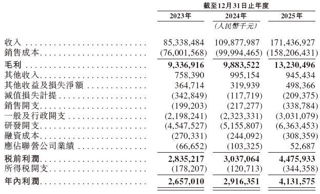 招股书显示,在过去的2023年、2024年和2025年,华勤技术的营业收入分别为人民币853.38亿、1,098.78亿和1,714.37亿元,相应的净利润分别为人民币26.57亿、29.16亿和41.31亿元。