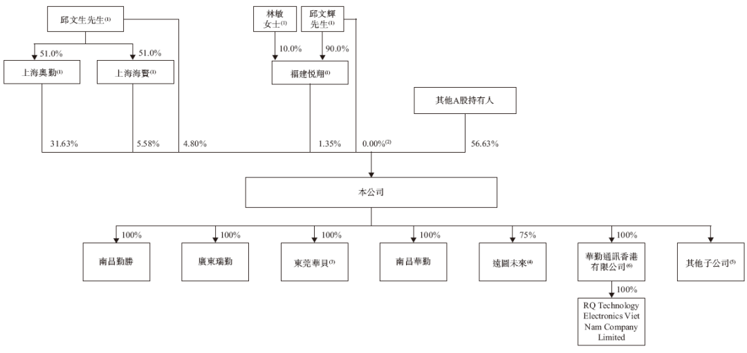邱文生先生直接持股4.80%,通过上海奥勤、上海海贤分别持股31.63%、5.58%;邱文辉先生(邱文生先生的兄弟,他们一致行动)直接持有少量股份,以及通过福建悦翔持股1.35%;
