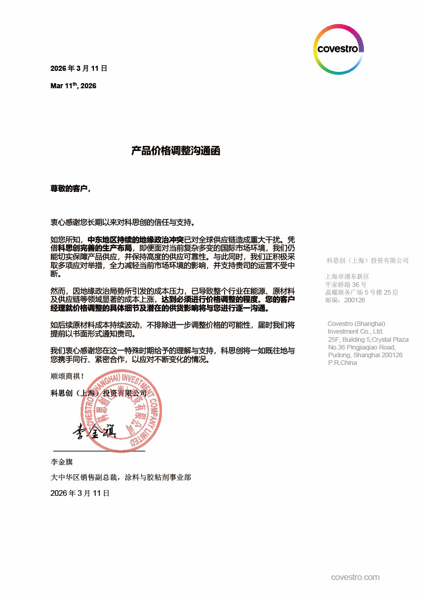 另一份面向涂料与胶粘剂事业部的客户沟通函则进一步说明,中东地缘政治冲突引发的能源、原材料及供应链全链条成本上涨,已达到必须进行价格调整的程度,后续不排除根据原材料成本波动进一步调价的可能。