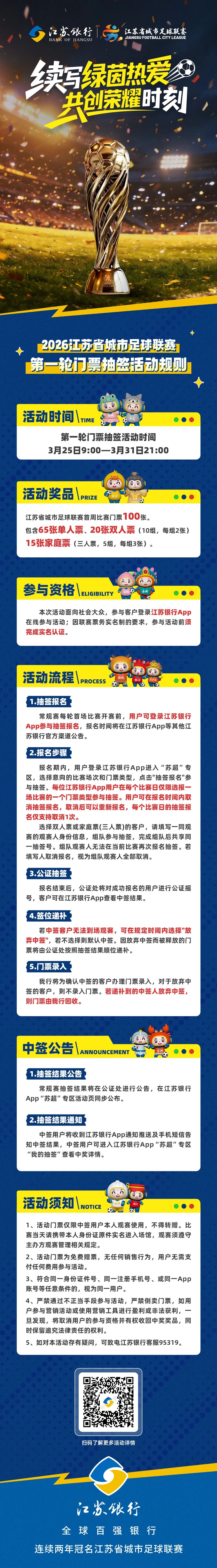 江苏银行“苏超”首轮门票抽签3.25开启,每场 100 张