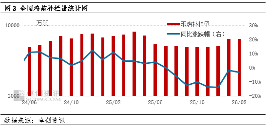 小码蛋减少,折射后备产能缺口扩大。小码蛋主要来源于120-200日龄的新开产蛋鸡,其供应紧缺直接印证了前期鸡苗补栏低迷、后备鸡群不足的行业现状。根据卓创资讯数据显示,自2025年7月,商品代蛋鸡苗销量持续处于同比下滑态势,2025年11月份同比降幅近15%。按照蛋鸡4个月左右的育成周期推算,这批低补栏量已传导至当前新开产环节,导致小码蛋货源逐渐缩减。作为产能先行指标,小码蛋减少意味着后期鸡蛋产量增量有限,中长期产能收缩趋势成为定局。
