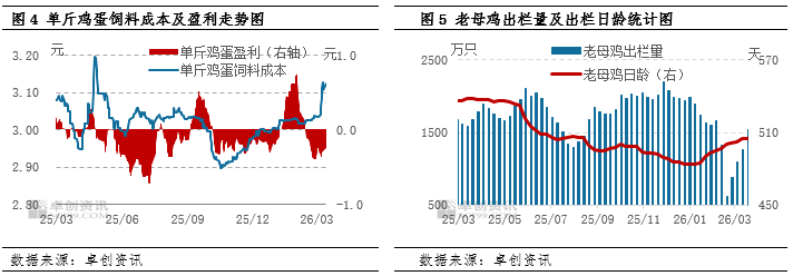 春节过后,养殖端普遍抱有延淘惜售心态,淘汰鸡出栏量持续低位运行,老鸡积压进一步加剧大码蛋供应压力。但近期饲料成本快速抬升,养殖端惜售心态略有松动,淘鸡意愿有所增强。近期国内玉米、豆粕价格同步上涨,推动饲料成本持续提升。截至3月第二周,单斤鸡蛋饲料周度成本上涨至3.11元,较1月初涨幅上涨0.11元,进入3月份以后,蛋价虽小幅上涨,但受到饲料成本同步提升影响,养殖单位盈利空间被压缩,鸡蛋仍然处于亏损状态,目前单斤鸡蛋仍亏损0.30元左右。