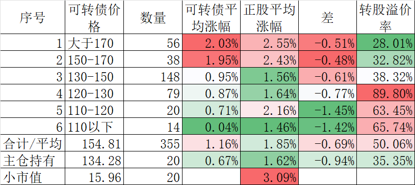 355只可转债平均上涨1.16%,对应正股平均上涨1.85%。我的主仓20只可转债平均上涨0.67%,对应正股平均上涨1.62%。