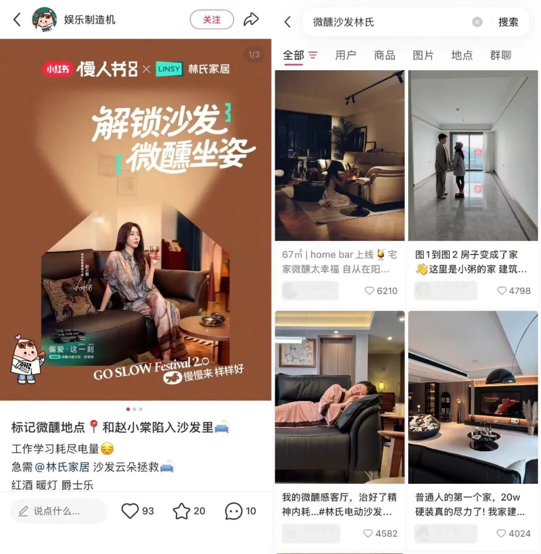 林氏家居的“微醺沙发”就基于小红书站内用户的真实表达,捕捉到年轻人正在增长的一类情绪需求,如加班后的自我放松、独处时的悦己时刻,以及关系中的情感连接。