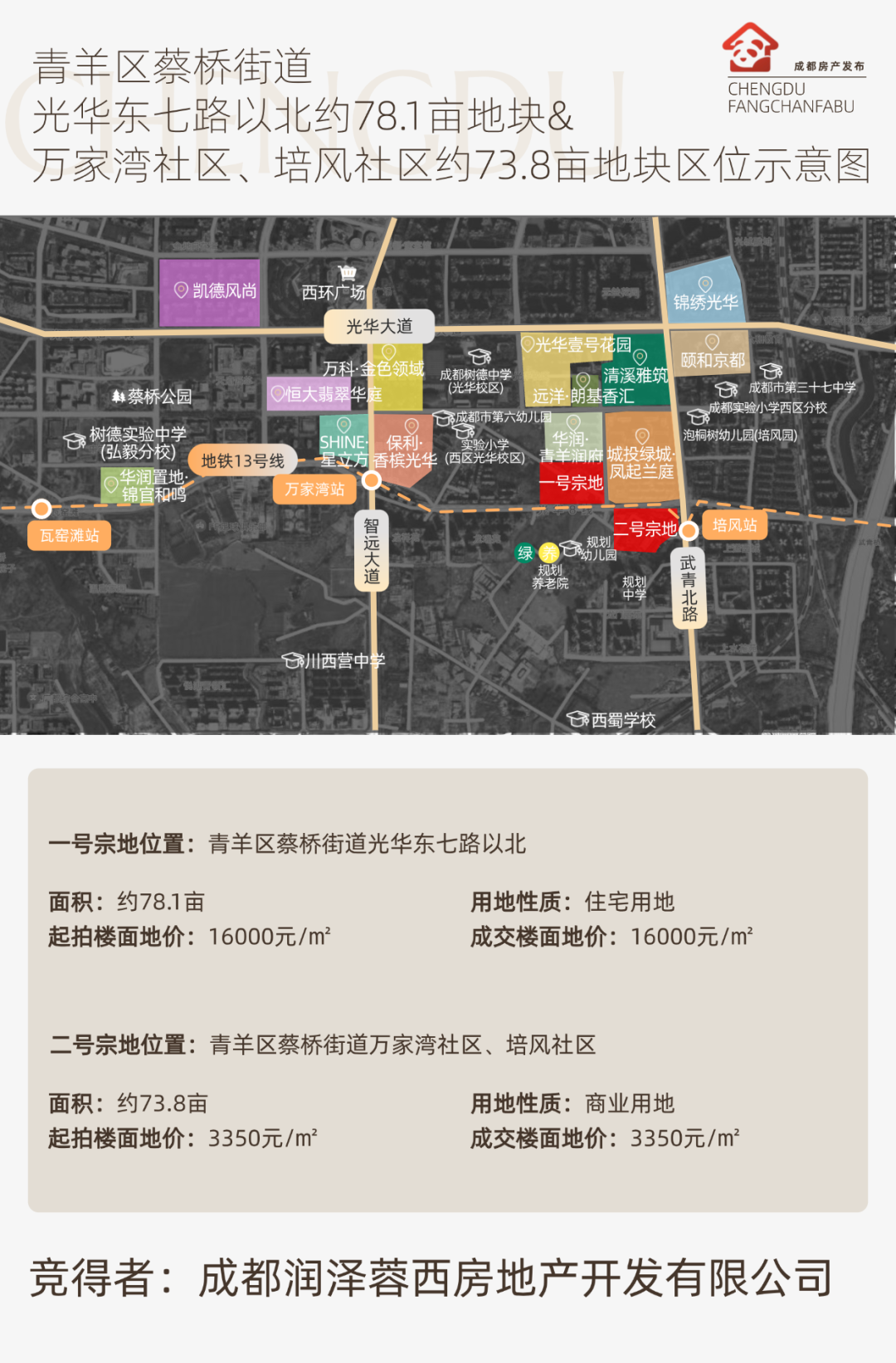 刚刚,华润置地拿下了青羊蔡桥街道两块宗地:一宗78.1亩住宅用地,容积率2.5,成交楼面价16000元/㎡;另一宗位73.8亩住宅用地,容积率2.4,成交楼面价3350元/㎡。