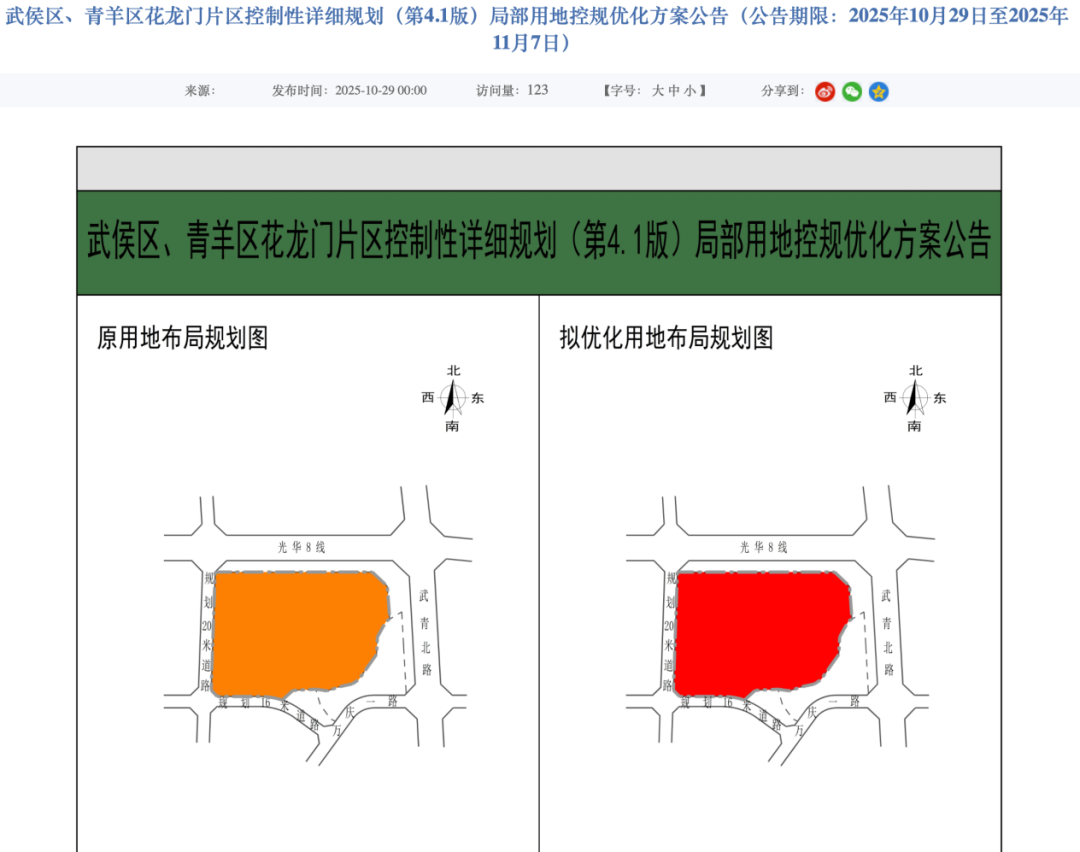 2025年10月,成都市规划和自然资源局发布武侯区、青羊区花龙门片区控制性详细规划(第4.1版)局部用地控规优化方案公告,公告涉及培风地铁站旁的土地用地性质调整:将原规划商业服务业用地、二类城镇住宅用地,优化调整为商业服务业用地,其余规划指标保持不变。这也被视作华润万象系商业即将到来的信号。