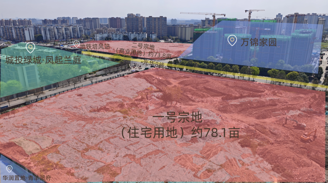 约78.1亩住宅地块紧邻此前华润置地打造的青羊润府项目;而约73.8亩的商业地块则紧邻地铁培风站E口,是一个地铁商业。