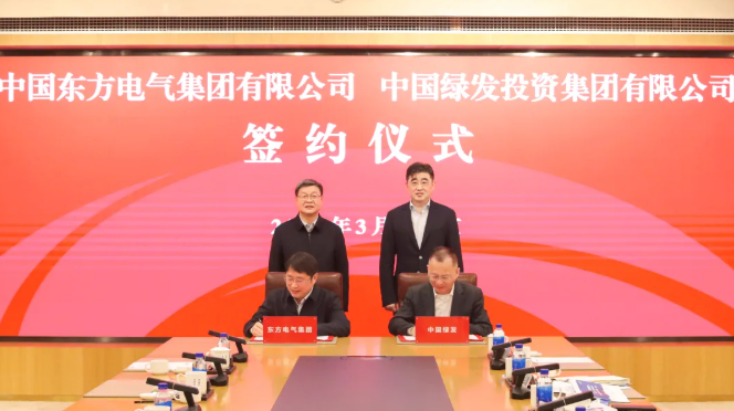 3月25日,中国绿发投资集团有限公司(简称:中国绿发)与中国东方电气集团有限公司(简称:东方电气集团)签署战略合作框架协议。中国绿发党委书记、董事长孙瑜与东方电气集团党组书记、董事长罗乾宜进行会谈并共同见证签约。中国绿发党委副书记、总经理蓝海出席签约活动。中国绿发党委委员、总会计师李斌,东方电气集团党组成员、副总经理李建华代表双方签署协议。