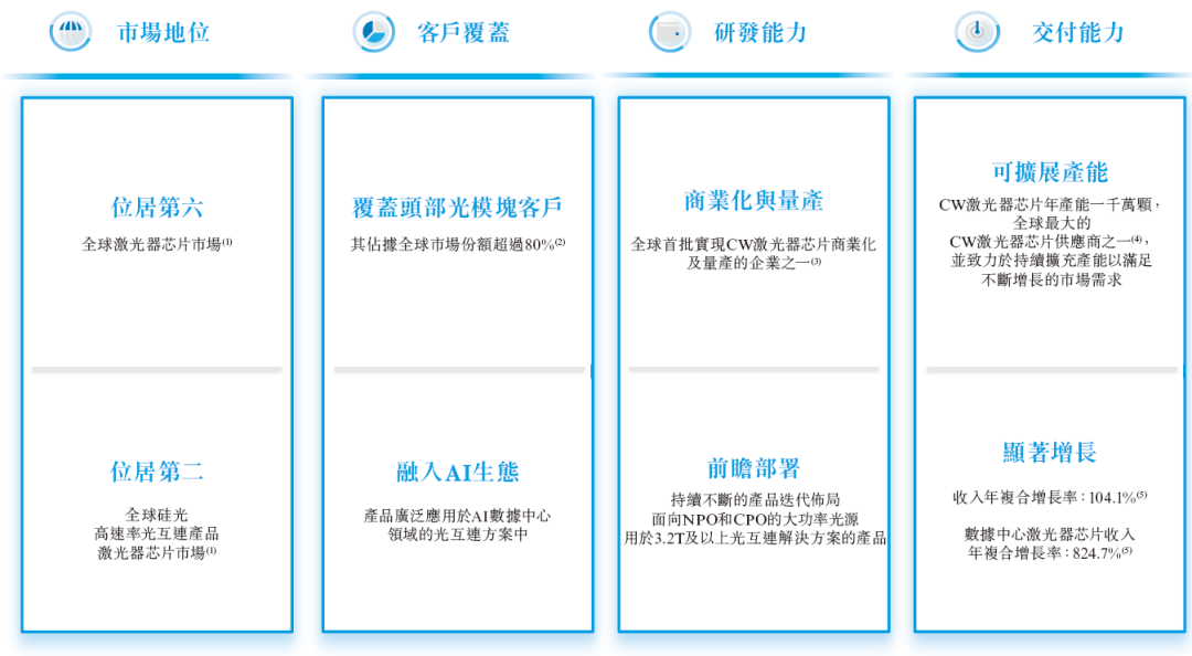 根据灼识咨询的报告,于2025年按对外销售收入计,源杰科技是全球第六大激光器芯片供货商以及全球第二大硅光高速率光互连产品激光器芯片供货商。公司是全球少数能够以千万颗单位规模量产CW激光器芯片的公司之一。