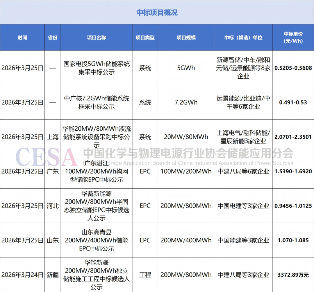 中标方面,3月25日,国家电投2026年度第4批集中招标(第一批储能系统设备)中标候选人公示,共采购储能系统5GWh,新源智储/中车/融和元储/远景能源等8家企业突围,中标单价区间0.5205-0.5608元/Wh;中广核新能源2026年度储能系统框架采购项目中标结果公示,远景能源/比亚迪/中车等6家企业依次中标各标段,报价在0.491-0.53元/Wh。