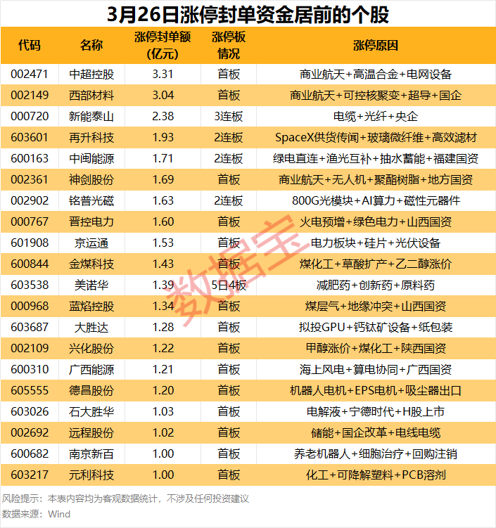 以封单金额计算,中超控股、西部材料、新能泰山涨停板封单资金居前,分别有3.31亿元、3.04亿元、2.38亿元,其中前两股均为商业航天概念股。