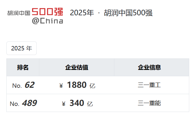 近日,胡润研究院发布《2025胡润中国500强》(Hurun China 500 Most Valuable Private Companies 2025),三一重工、三一重能齐齐登榜。