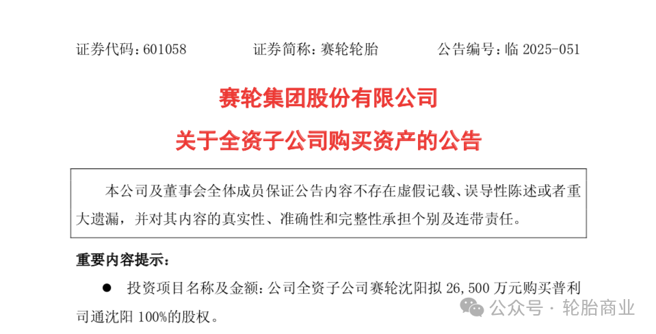 2025年7月14日,赛轮集团以2.65亿人民币购买普利司通(中国)投资有限公司持有的普利司通(沈阳)轮胎有限公司100%的股权。与工厂一同收入囊中的还有“和平轮胎”。