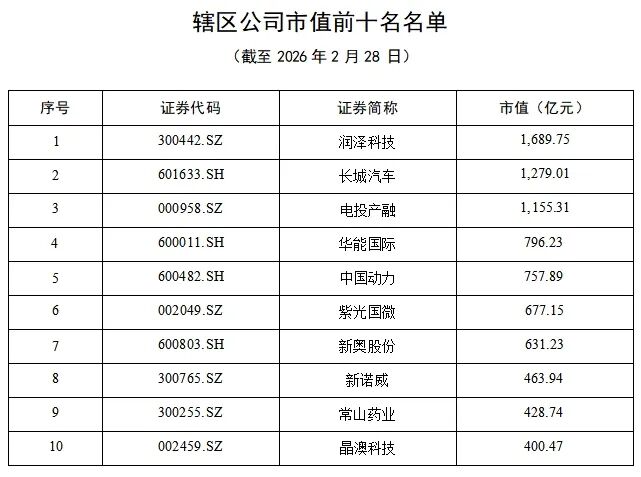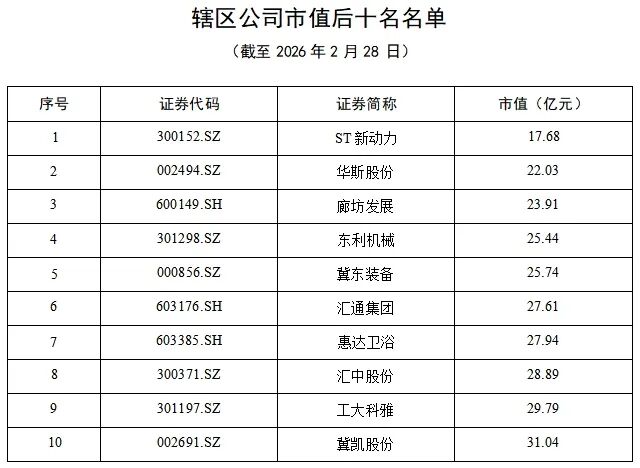 截至2026年2月28日,河北境内上市公司家数为85家,其中沪市27家(主板26 家、科创板1家)、深市48家(主板24家,创业板24家)、北交所10家。上市公司总市值为16,592.43亿元,较年初增加17.70%,同比增加37.63%。截至2026年2月28日,河北辖区上市公司直接融资422.13亿元。