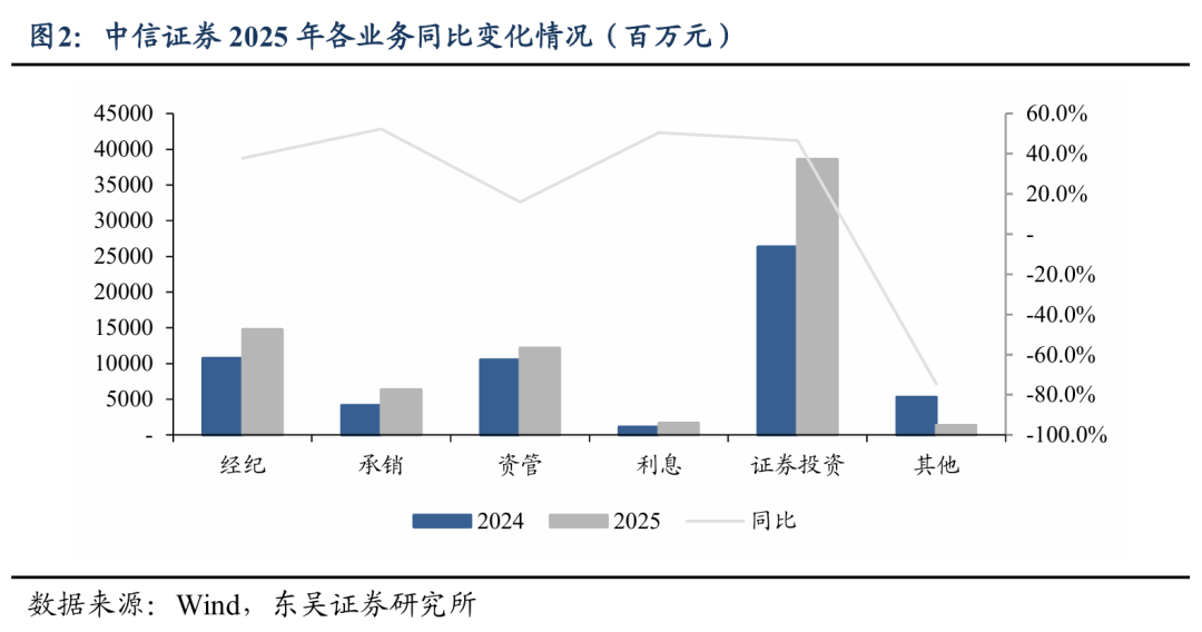 交易额大增,带动经纪业务收入大幅增长。经纪业务收入147.5亿元,同比+37.7%,占营业收入比重19.7%。经纪业务收入大幅增长主要是由于市场交投活跃,2025年市场日均股基交易额2.05万亿元,同比+70%。 2025年末,公司存续客户数超1700万,同比+10%,托管资产规模超15万亿元,同比+24%,户均资产规模有所提升。公司两融余额2077亿元,同比+50%,市场份额8.2%,较年初+0.8pct。