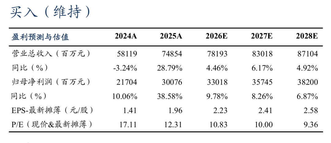 盈利预测与投资评级:2026年以来市场交投情绪火热,我们预计公司2026-2027年的归母净利润为330/357亿元(前值为318/334亿元),同比分别+10%/+8%,预计2028年净利润为382亿元,同比+7%,对应2026-28年PB为1.05/0.99/0.93倍。公司龙头地位稳固,盈利能力远高于行业平均水平,经营稳健且各项业务均排名行业前列,应享有一定估值溢价。维持“买入”评级。