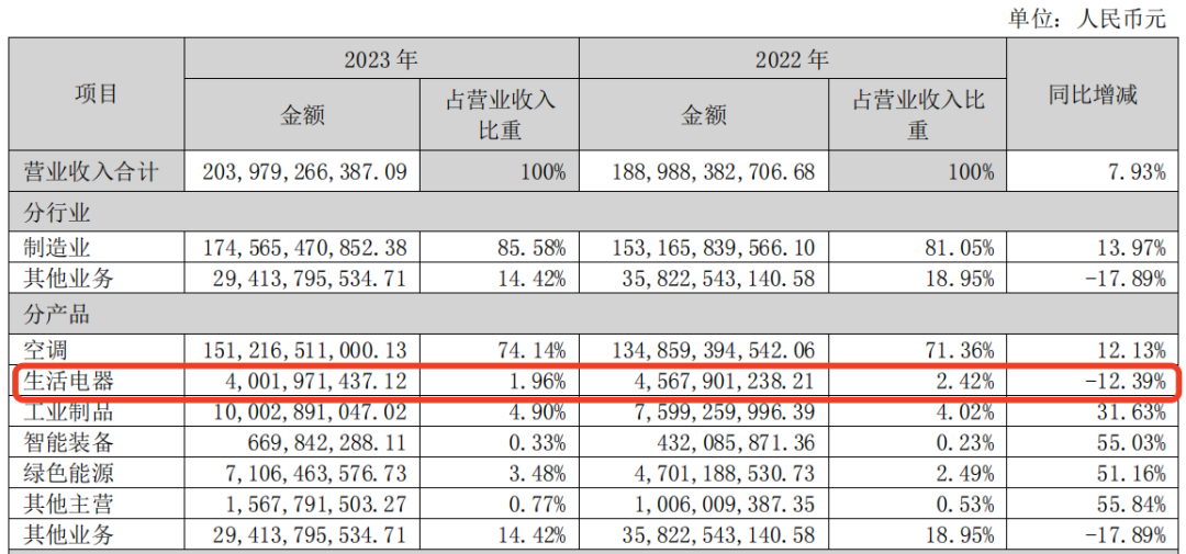 格力2023年年报显示,格力生活电器(含冰洗厨卫)营收仅为40亿,同比减少12.39%,占公司总营收不足2%。到了2024年年报,生活电器(含冰洗厨卫)这一数据则已不再单独披露。