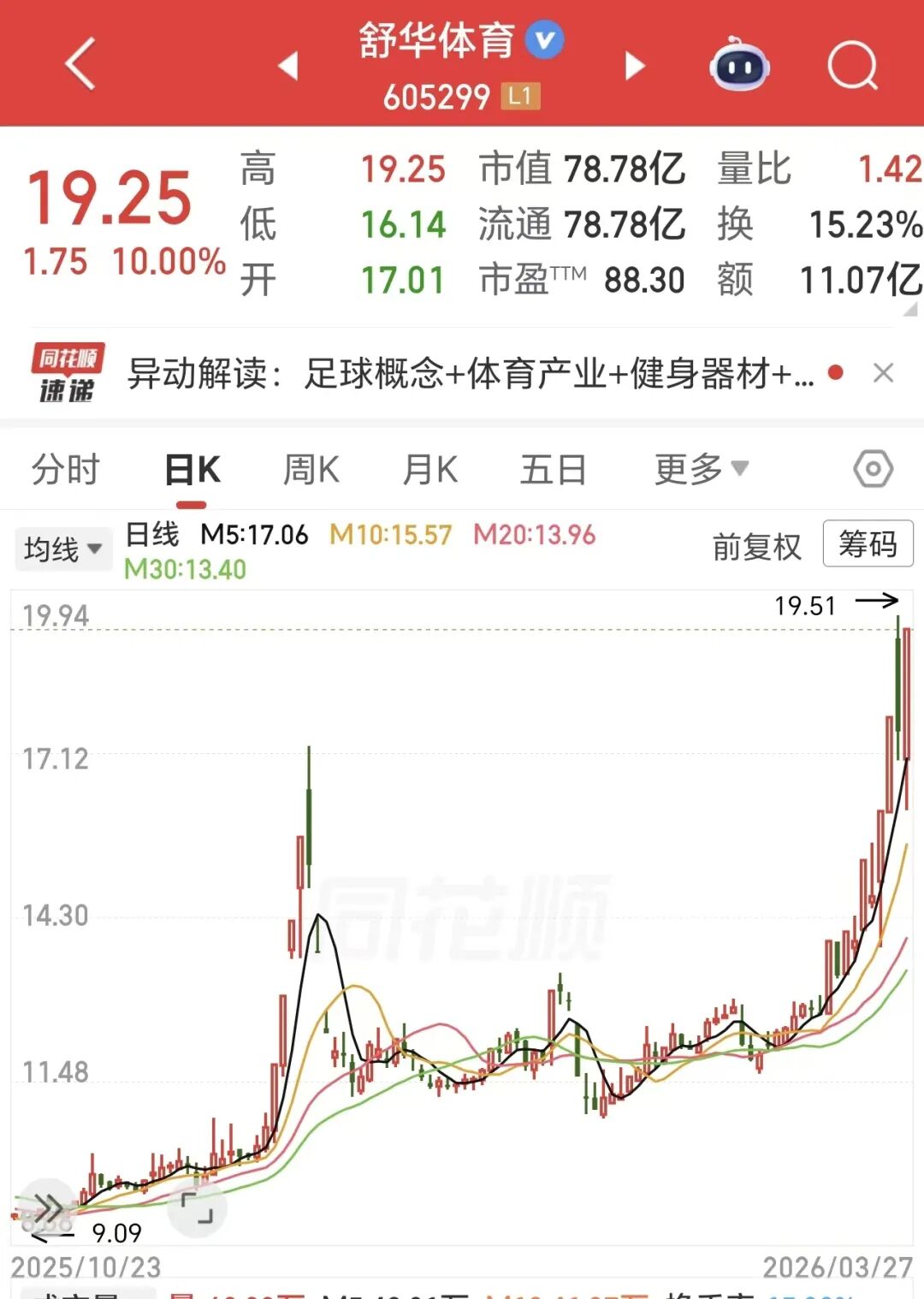 3月27日,体育产业板块表现活跃,舒华体育(605299.SH)在日内低开的情况下尾盘强势涨停,斩获6个交易日内的第4个涨停板。截至收盘,该股报19.25元/股,全天成交额达10.97亿元,换手率为15.10%,最新A股总市值升至78.78亿元。
