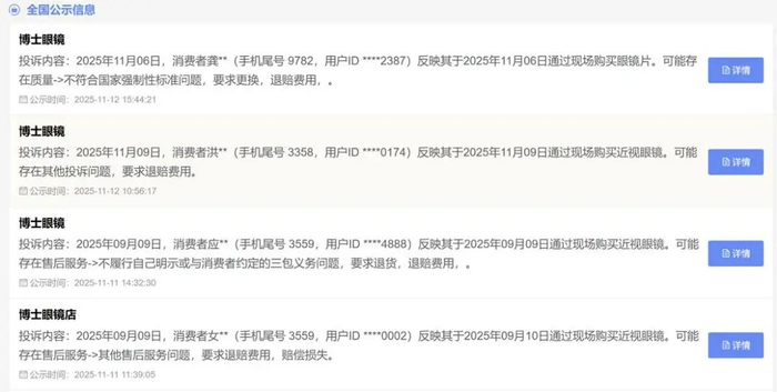 然而,现实情况与这一专业形象存在一定落差。根据全国12315消费投诉信息公示平台数据,近一年来,博士眼镜累计投诉量已达200余起,且投诉对象多为线下门店,问题集中在“售后服务差”和“验光不准确”等方面。