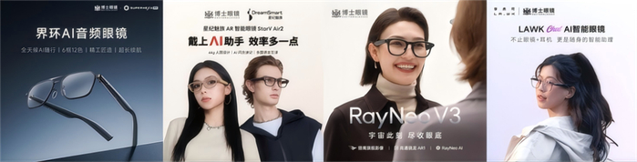 在管理层面,自 2023 年起,博士眼镜就积极布局智能眼镜领域,启动“智慧视觉生态”计划,被市场视为“AI 眼镜第一股”。公司先后与雷鸟创新、星纪魅族、李未可等品牌达成战略合作,并于 2024 年上半年与雷鸟创新合资成立科技公司,计划推出拍摄眼镜和 AI 音频眼镜等产品。博士眼镜还探索智能眼镜与线下门店的深度融合模式。与各大智能眼镜品牌的紧密合作,将智能眼镜产品引入全国数百家线下门店。
