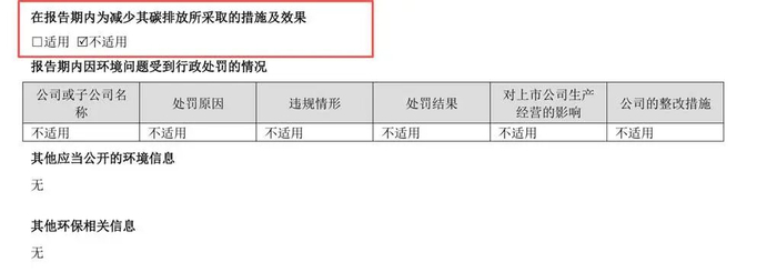除此之外,在年报中“为减少碳排放所采取的措施及效果”一栏,公司直接勾选“不适用”。此举在“双碳”目标已成为国家战略、越来越多上市公司主动披露碳管理路径的行业背景下,显得尤为滞后。这反映出公司在绿色低碳转型意识方面的不足,也揭示了其缺乏清晰的顶层绿色战略与中长期碳中和目标。