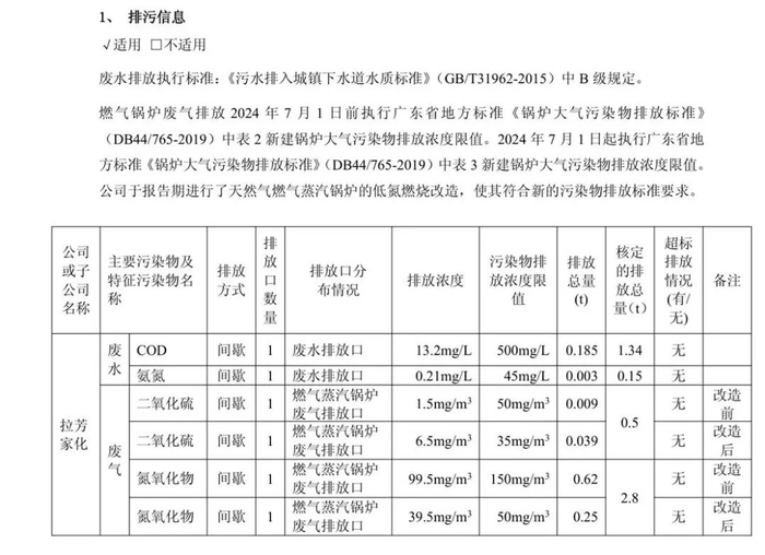 在环境目标与绩效方面,拉芳尚未设立公开的、量化的中长期减排目标,也未在年报中系统披露关键绩效指标。尽管公司年报中提及通过废水处理、节能设备等环保技术以降低环境影响,但披露信息多局限于排放浓度与是否达标等合规性内容,未能全面反映其环境影响的规模与变化趋势。