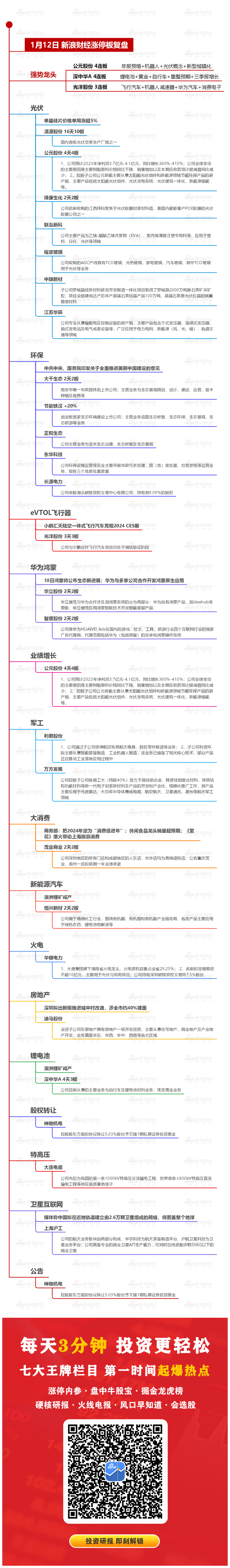 【1月12日沪深两市涨停分析】创业板指收跌0.91%,环保、光伏板块逆势活跃。公元股份、深中华A双双晋级4连板,光洋股份走出3连板,一图看懂>>