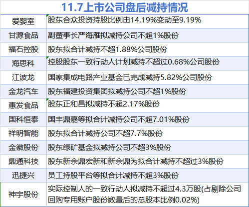 【11月7日上市公司减持汇总:祥明智能等13股拟减持(表)】据统计,11月7日,盘后包括爱婴室、甘源食品、福石控股、海思科、江波龙、金龙汽车、惠发食品、国科恒泰、祥明智能、金徽股份、鼎通科技、迅捷兴、神宇股份在内的13家A股上市公司披露减持情况。