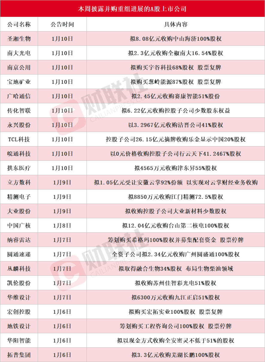 【超20家A股上市公司本周披露并购重组最新公告 TCL科技子公司26亿元摘牌收购乐金显示中国20%股权】据不完全统计,截至发稿,本周(1月6日-1月12日)包括圣湘生物、南大光电、南京公用、宝地矿业、广哈通信、传化智联、永兴股份、TCL科技、皖通科技、拱东医疗、立方数科、精测电子、大业股份、中国广核、纳睿雷达、圆通速递、丛麟科技、凯伦股份、华维设计、宏创控股、地铁设计、华阳智能和拓普集团在内的23家A股上市公司披露并购重组进展最新公告。其中,TCL科技公告,控股子公司26.15亿元摘牌收购乐金显示中国20%股权。小财注:拟间接收购云掌财经的立方数科周五20CM一字涨停。(财联社)