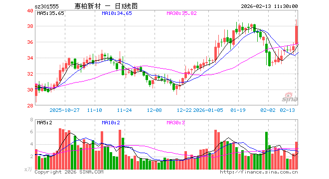 惠柏新材收于36.000元,涨幅4.29%,成交金额3.6355亿元,换手率45.96%。