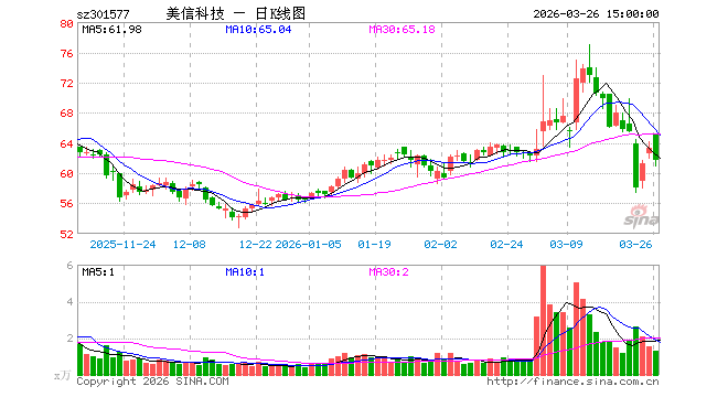 美信科技收于77.780元,跌幅4.65%,成交金额4.1155亿元,换手率48.58%。