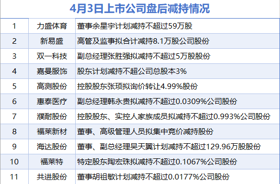 【4月3日增减持汇总】据统计,4月3日,截止发稿前,盘后暂无上市公司披露增持情况;力盛体育、新易盛、双一科技、嘉曼服饰、高测股份、惠泰医疗、濮耐股份、福莱新材、海达股份、福莱特、共进股份等11家上市公司披露减持情况。