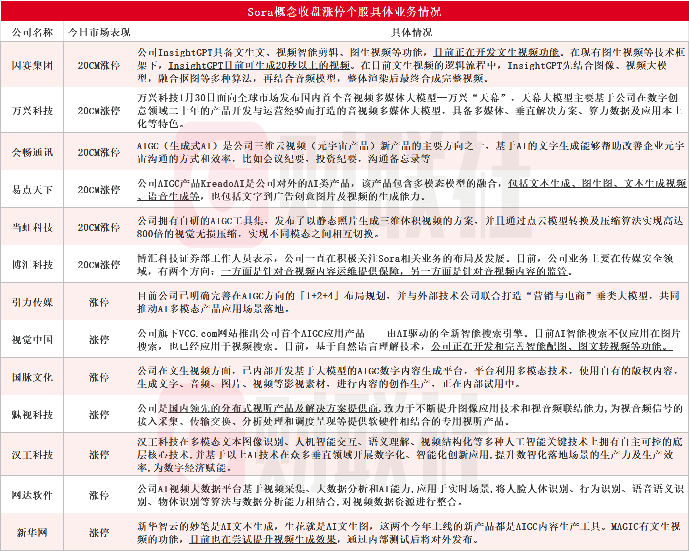【文生视频模型Sora火爆全网 概念股掀涨停潮 十余家上市公司火速回应】受文生视频模型Sora火爆全网的利好消息刺激,A股相关概念股掀涨停潮,因赛集团、万兴科技、会畅通讯、易点天下、当虹科技和博汇科技等收盘20CM涨停,引力传媒、视觉中国、国脉文化、魅视科技、汉王科技、网达软件和新华网等收盘涨停。据不完全统计,截至发稿,包括岭南股份、会畅通讯、名臣健康、因赛集团、首都在线、中科信息、萤石网络、凌云光、云从科技、当虹科技、易点天下、汉王科技、博汇科技和海康威视在内的14家上市公司今日回复Sora相关情况。其中,因赛集团表示,将在三月进行文生视频功能的开发,等待时机成熟后投入公测。