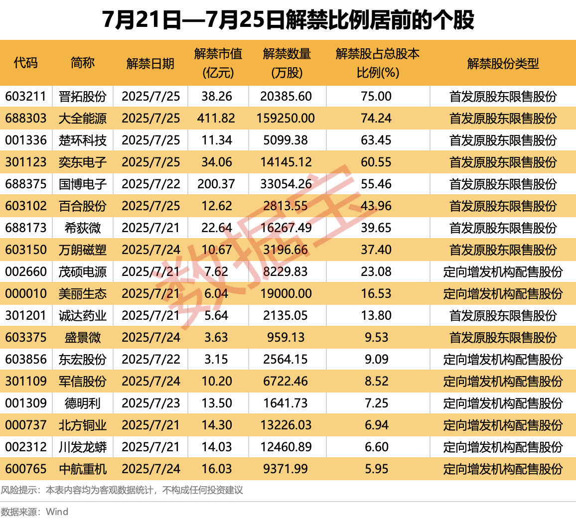 【下周A股解禁市值逾870亿元】据统计,下周(7月21日至25日),A股将有45家上市公司迎来限售股解禁。以个股最新价计算,45家上市公司解禁股对应市值合计877.85亿元。从解禁规模来看,14股解禁市值均超过10亿元。大全能源解禁市值高达411.82亿元;国博电子随后,解禁市值达200.37亿元;晋拓股份和奕东电子的解禁市值均在30亿元以上。从解禁类型上看,上述4股均为首发原股东限售股份。