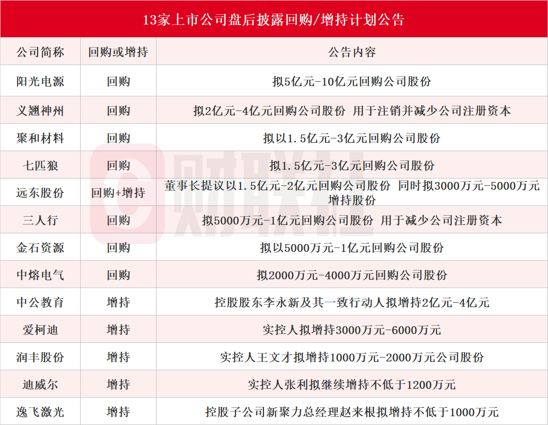 【10余家上市公司盘后披露回购或增持计划公告 义翘神州拟最高4亿元回购并注销】截至发稿,据不完全统计,盘后包括阳光电源、义翘神州、聚和材料、七匹狼、远东股份、三人行、金石资源、中熔电气、中公教育、爱柯迪、润丰股份、迪威尔、逸飞激光在内的13家A股上市公司披露回购或增持计划公告。具体来看,8家上市公司披露回购计划公告。其中,义翘神州拟2亿元-4亿元回购股份,用于注销并减少公司注册资本;远东股份董事长提议以1.5亿元-2亿元回购公司股份,同日公告拟3000万元-5000万元增持股份。除远东股份外,还有5家上市公司披露增持计划公告,其中,中公教育控股股东李永新及其一致行动人拟增持2亿元-4亿元。