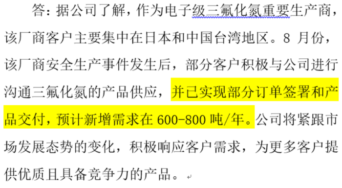 2025年8月,日本关东电化涩川工厂爆炸,全球三氟化氮产能骤减3700吨。一个月后,中船特气(688146.SH)的海外订单开始激增。8月,部分客户与公司沟通三氟化氮供应;9月,已实现部分订单交付。