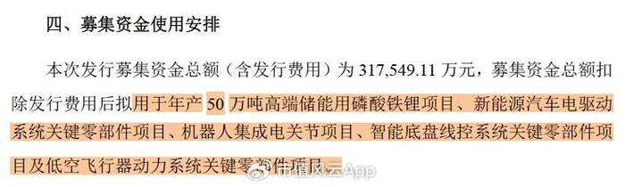 此次募资将用于年产50万吨高端储能用磷酸铁锂项目、新能源汽车电驱动系统关键零部件项目、机器人集成电关节项目等。