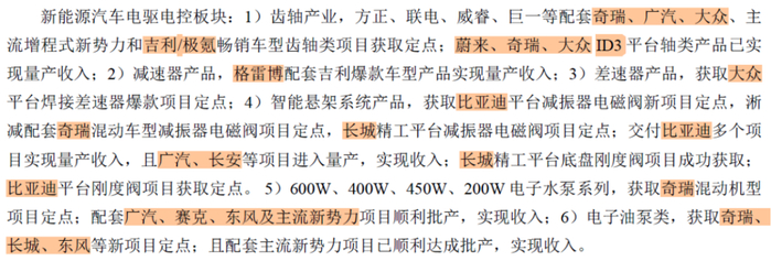 在新能源汽车电驱电控板块,减速器配套吉利爆款车型产品实现量产收入,智能悬架系统获比亚迪、奇瑞、长城项目定点,交付比亚迪、广汽、长安等项目进入量产。