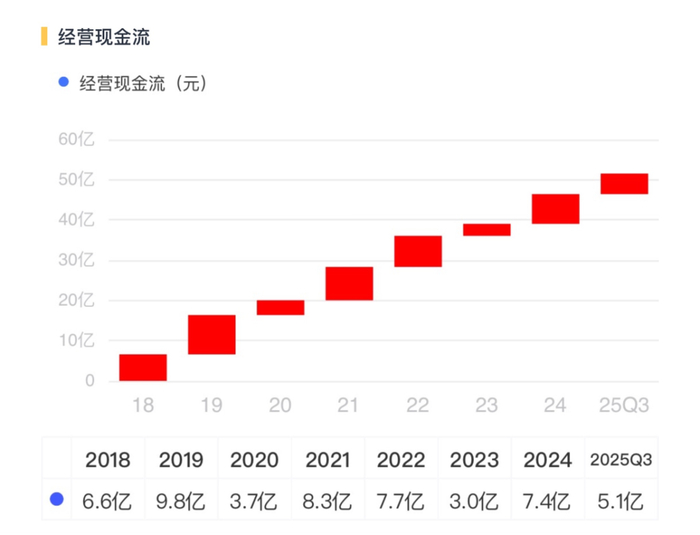 其次,现金流强悍。2025年前三季度,公司经营现金流净额同比激增381%,达到5.1亿,利润实实在在地变成了现金,运营质量很高。